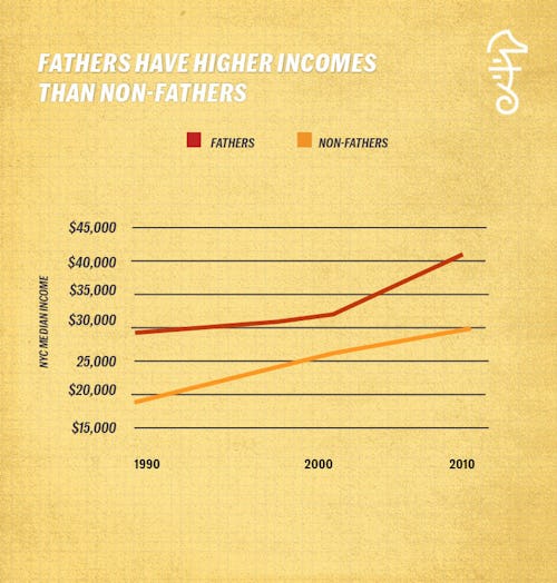 Beyond the biological implications of fatherhood, studies have shown that men with children experience psychological and social changes, too. But, unlike women who take pay cuts when they give birth, the financial impact of fatherhood on men is quite positive. The data below comes from City University of New York research, which found that fathers in the city have made more money, on average, than non-fathers since at least 1990. It is unclear whether the sudden burden of diapers and saving for college drives men to earn more, or whether it’s simply wealthier men who choose to start families. But one thing is clear from the preponderance of research: fatherhood changes men. Financially, hormonally, and neurologically.