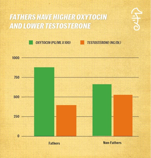 In 2014, a team of scientists at Emory University recruited 88 heterosexual, biological, married fathers of children between the ages of 1 and 2, for an unprecedented experiment. They tested their hormone levels (among other metrics) and compared these results to a group of 50 non-fathers. One of the most striking results is depicted below. Compared to non-fathers, dads had lower levels of testosterone, a male hormone linked to aggression, and higher levels of oxytocin, a hormone thought to play a role in maternal (and now, perhaps, paternal) attachment. The findings suggest that fathers, not just mothers, experience hormonal changes to help them adapt to their new roles as highly attached and less aggressive caregivers.