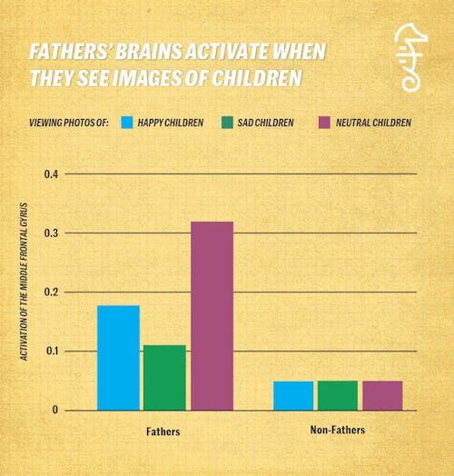 After running the hormone analysis, the researchers at Emory took the experiment one step further. They hooked each man up to an fMRI—which measures activation of different brain regions—and show him images of children and adults making happy, sad, and neutral faces. In the middle frontal gyrus, a brain region responsible for face emotion processing, fathers’ brain activities spiked for children’s faces significantly more than for adult faces. As depicted below, non-father brains made no such distinction. The results suggest that fathers’ brains change, too, helping them augment empathy towards children.